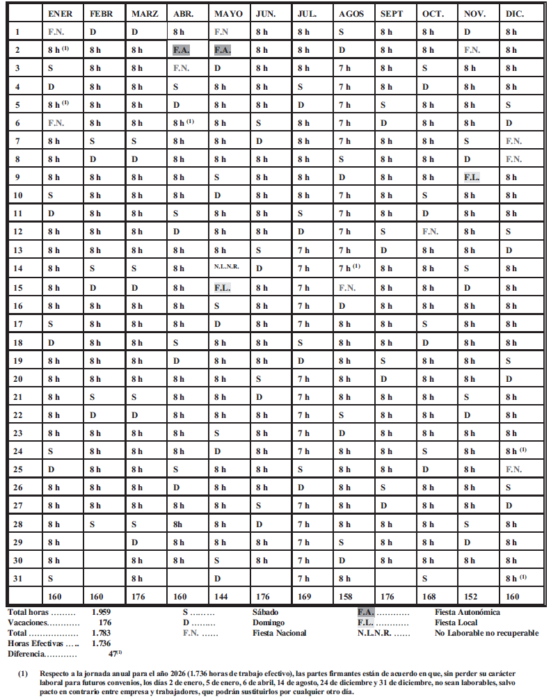 ANEXO XIII.- CALENDARIO LABORAL 2026.