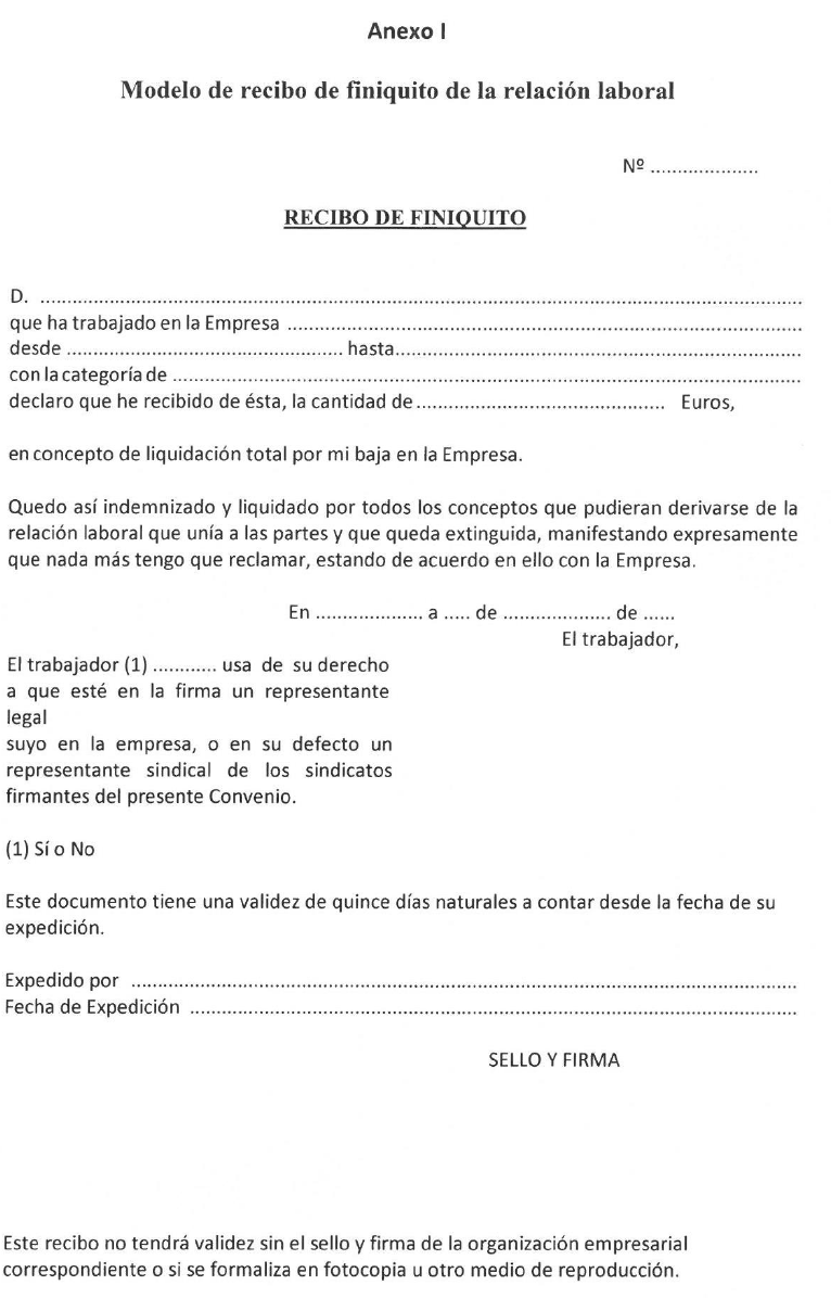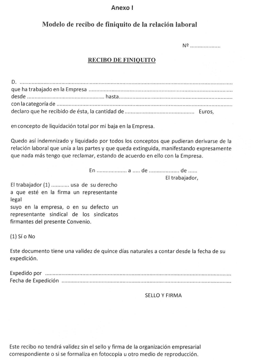 TERCERO.- Para dar cumplimiento al VII Convenio General del Sector de la Construcción se acuerda publicar el modelo de recibo de finiquito que obligatoriamente deberán utilizar todas las empresas afectadas por dicho convenio y que figura como anexo.
