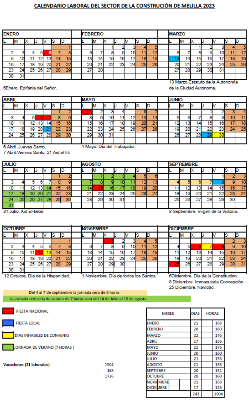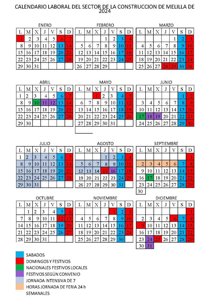 RESOLUCIÓN, ACTA Y CALENDARIO LABORAL 2024 CONVENIO DE LA CONSTRUCCIÓN. Resolución de fecha 17 de enero de 2024 del Área de Trabajo e Inmigración de la Delegación del Gobierno en Melilla por la que se registra y publica el Acta del Acuerdo de la Comisión Negociadora del Convenio Colectivo de Construcción de la Ciudad de Melilla, aprobando el calendario laboral 2024.