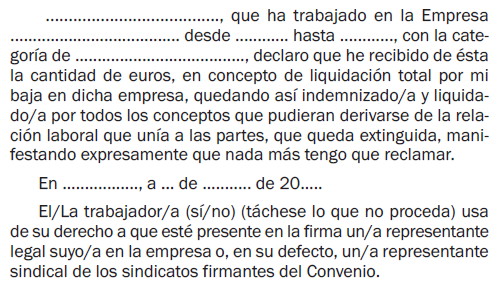 4. Finiquito: El recibo de finiquito de la relación laboral entre empresa y trabajador/a deberá ser conforme al modelo que figura como anexo IV de este Convenio.