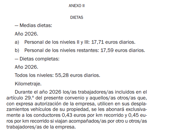 Durante el año 2025 (desde la firma del Convenio) a los/as trabajadores/as incluidos en el artículo 29.º del presente convenio y aquellos/as otros/as que, con expresa autorización de la empresa, utilicen en sus desplazamientos vehículos de su propiedad, se les abonará exclusivamente a los conductores 0,42 euros por km recorrido y 0,44 euros por km recorrido si viajan acompañados/as por otro u otros/as trabajadores/as de la empresa.