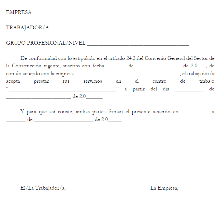 Esta cláusula, que deberá precisar las condiciones esenciales, ubicación de la obra y fecha de incorporación a la misma, así como las acciones formativas exigibles para ocupar el nuevo puesto, será sometida a aceptación por parte de la persona trabajadora con quince días de antelación a la finalización de su trabajo en la obra en la que se encuentre prestando servicios.