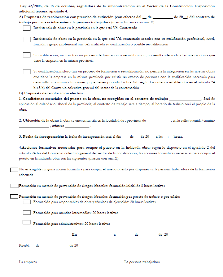 En el caso de que la recolocación lo requiera, el proceso de formación tendrá una duración de un máximo de 20 horas, según lo previsto en los apartados 1 y 2 del Anexo XII del presente CGSC, y dicho proceso se adecuará al puesto, nivel, función y grupo profesional que corresponda a la persona trabajadora, constituyendo requisito básico de acceso a dicha formación que ésta resulte necesaria en función, tanto de la propuesta formulada como del hecho de que no concurran cualquiera de los motivos de extinción establecidos en el apartado 5 de la disposición adicional tercera de la Ley 32/2006, de 18 de octubre, reguladora de la subcontratación en el Sector de la Construcción.