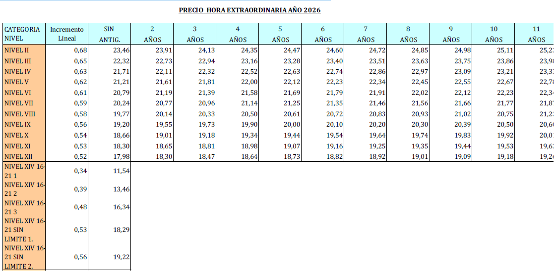 – Tabla de horas extraordinarias.