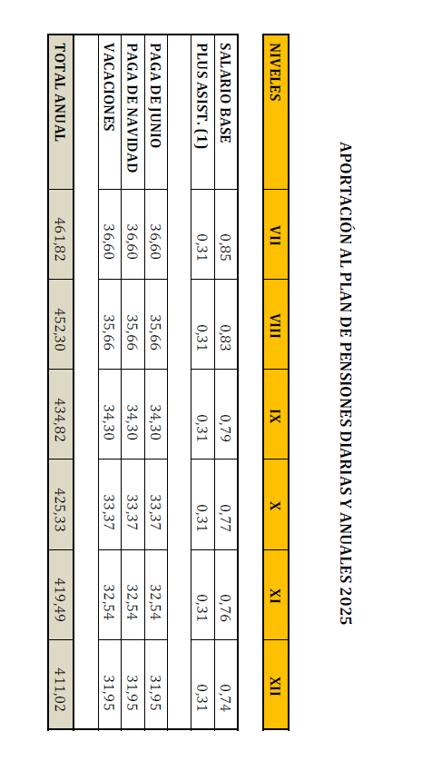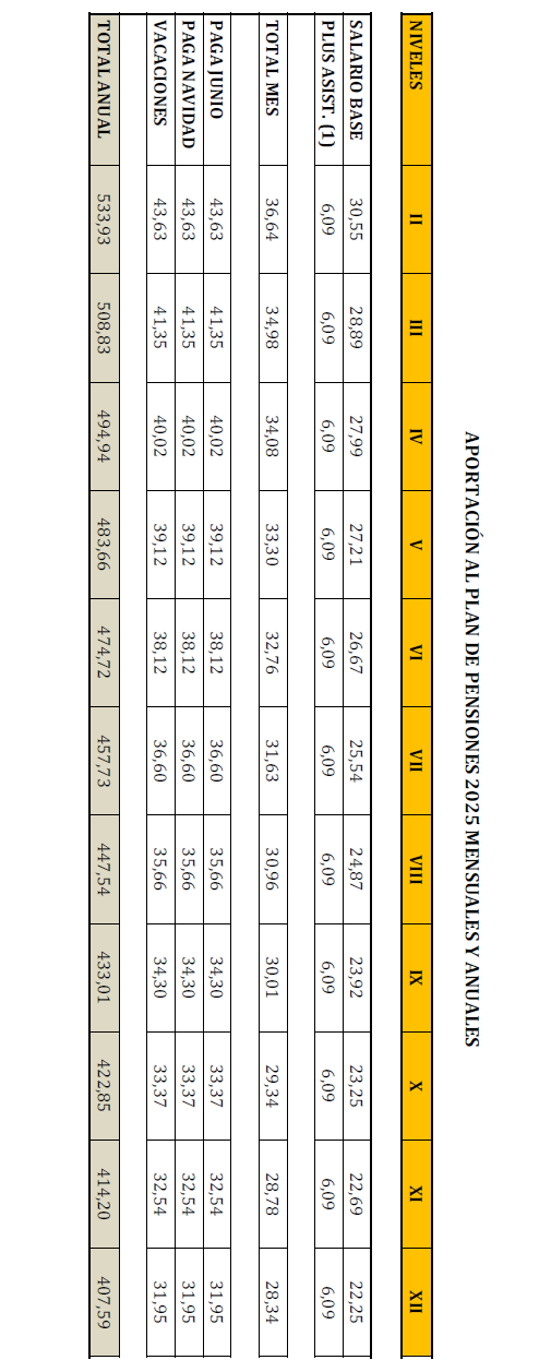 La contribución al plan de pensiones para el año 2025 se obtendrá añadiendo a la contribución al plan de pensiones del año 2024 revisada, el 0,50% de los conceptos salariales de las tablas salariales de 2024 revisadas del convenio colectivo de Huesca.