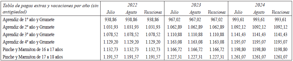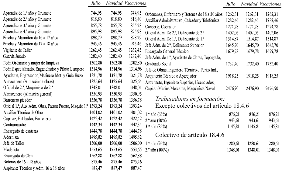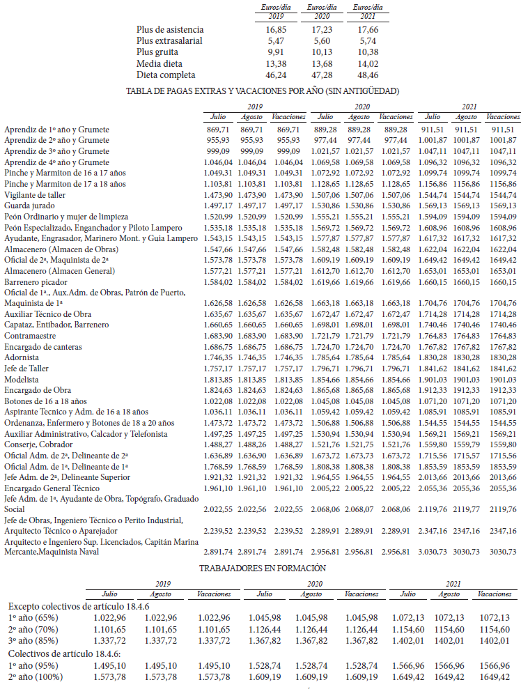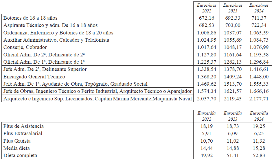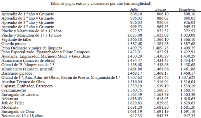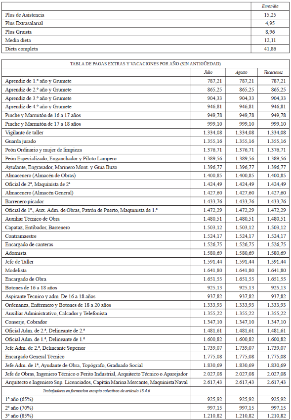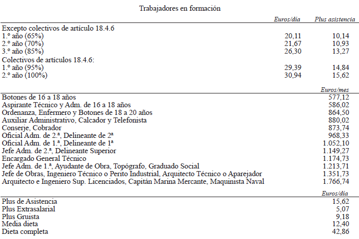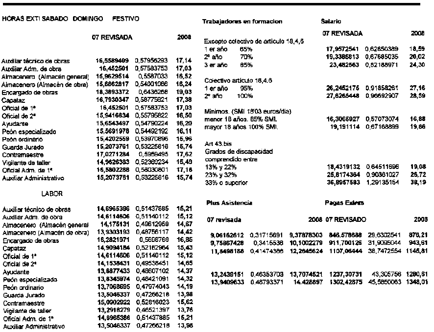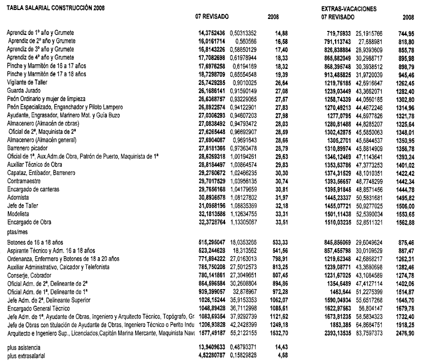Para el año 2008, se aplicará sobre los conceptos de salario base, gratificaciones extraordinarias, retribución de vacaciones y pluses salariales y extrasalariales, un incremento igual al de la previsión de inflación establecida para este año en la Ley de los Presupuestos Generales del Estado (2%) más un uno coma cincuenta por ciento (1,5%), sobre las tablas del año 2007.