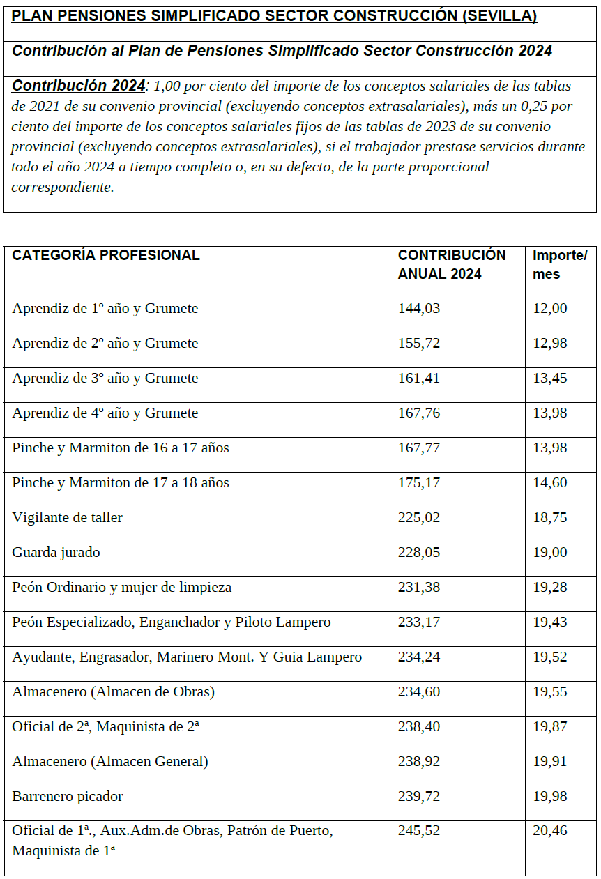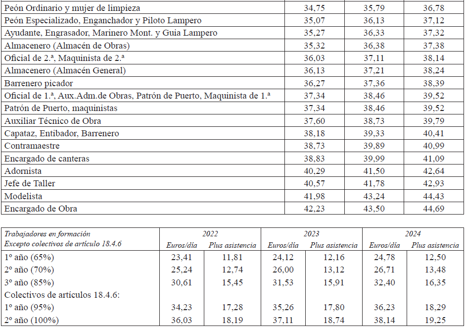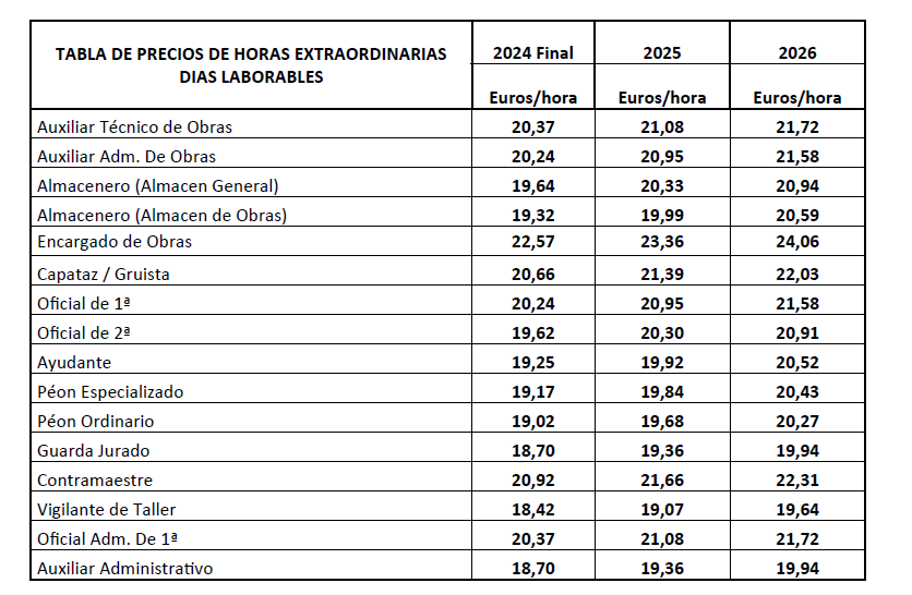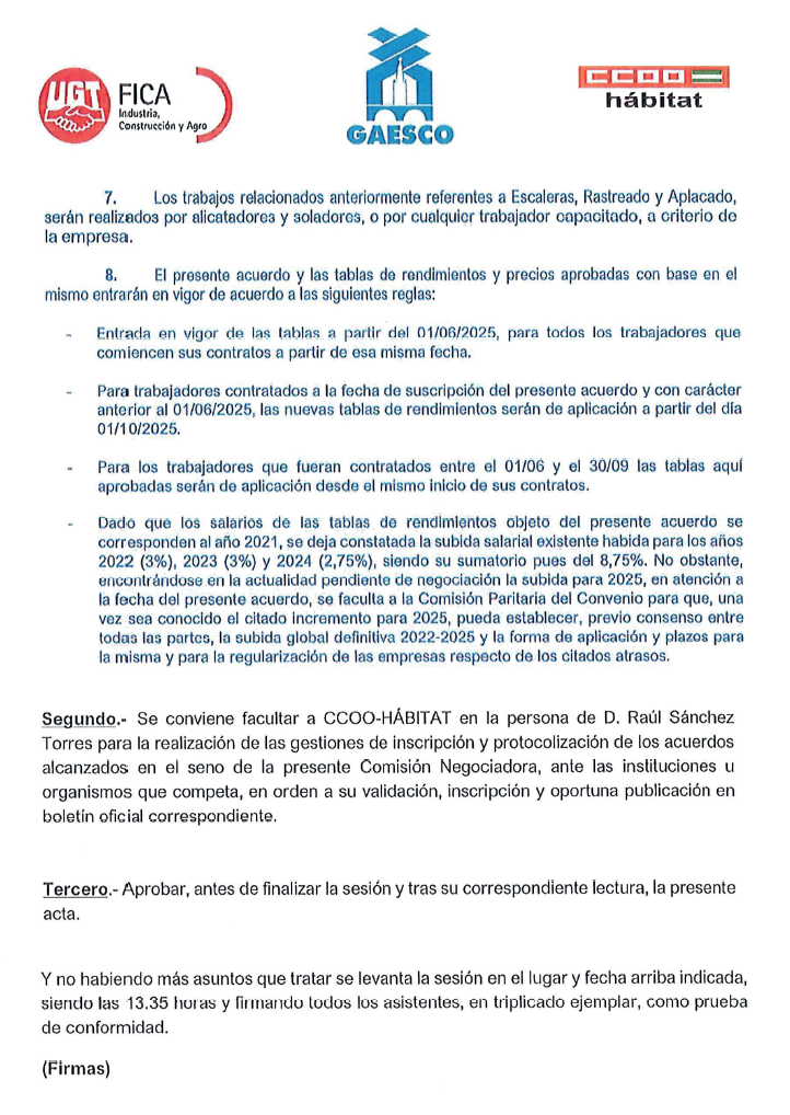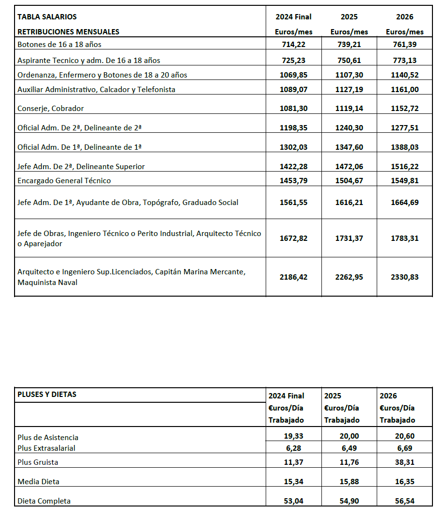 – Incremento salarial para 2025, con efectos retroactivos desde el 01/01/2025: 3,5% a tablas salariales + 0,5 adicional a contribución al plan de pensiones simplificado del sector de la construcción.