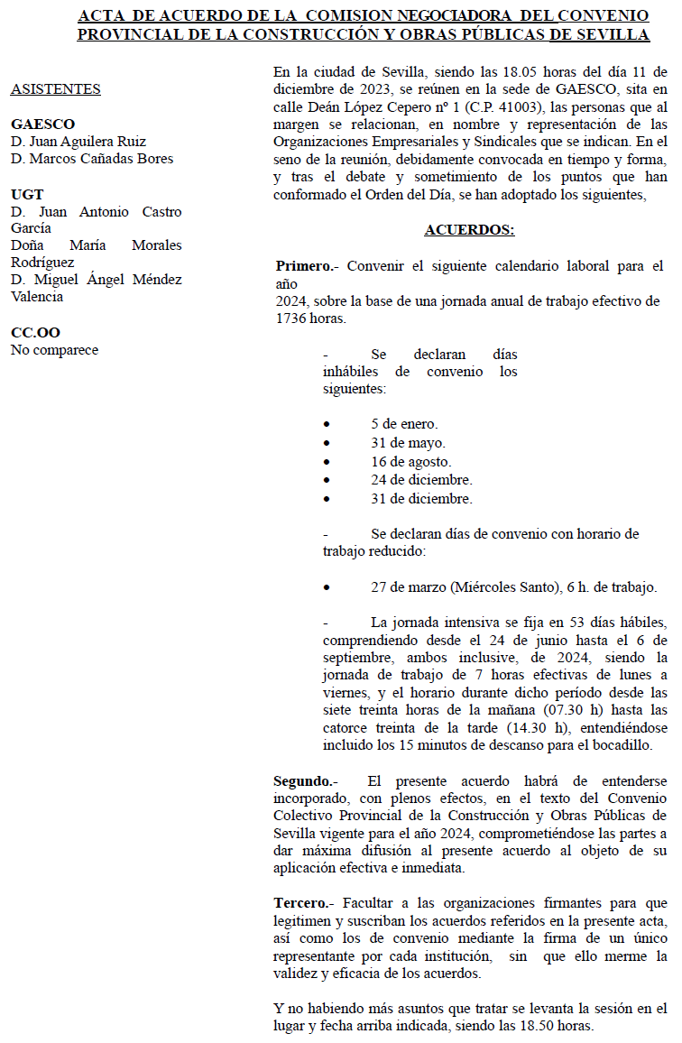 Que, en esta misma fecha, previa su convocatoria en legal forma, se constituyen en comisión negociadora del Convenio Colectivo provincial del sector de la construcción y obras públicas (Sevilla), negociar y, en su caso, aprobar el CALENDARIO LABORAL para el sector de la Construcción en l a p rovincia de S evilla d el a ño 2 025. A t al f in, t ras u n i ntenso debate e intercambio de propuestas con relación al único punto que ha conformado el Orden del Día , deciden por unanimidad adoptar los siguientes,