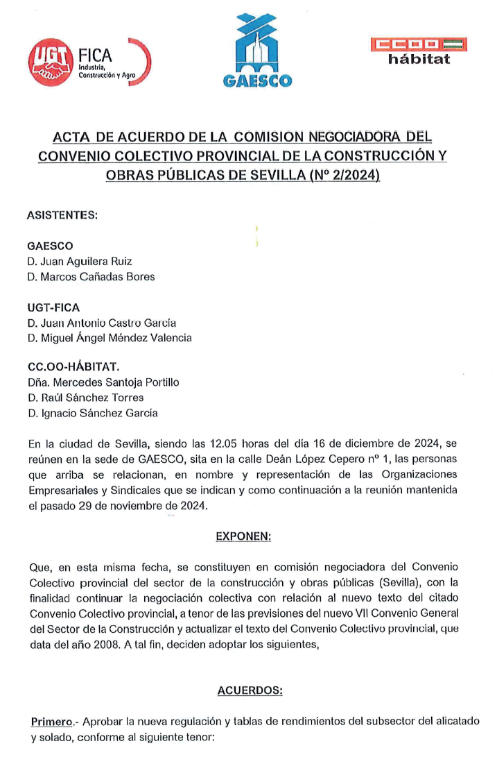 ACTA DE ACUERDO DE LA COMISION NEGOCIADORA DEL CONVENIO COLECTIVO PROVINCIAL DE CONSTRUCCIÓN Y OBRAS PÚBLICAS DE SEVILLA (Nº1/2025).