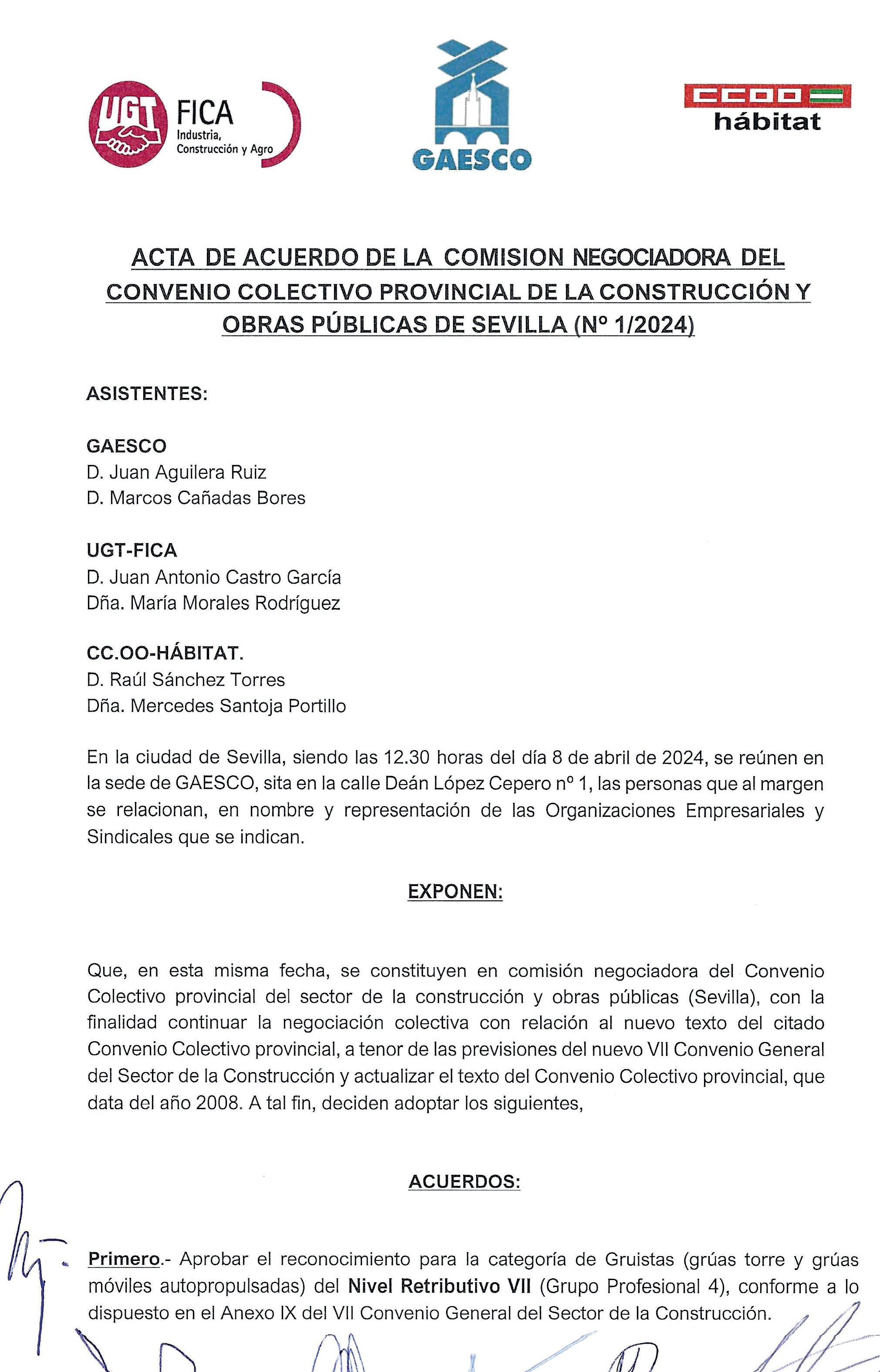 PRIMERO.- Registrar y ordenar la inscripción del Acuerdo de la Comisión Negociadora del Convenio Colectivo del Sector de la Construcción (Código 41000915011982), reconociendo la categoría de gruistas, de nivel retributivo VII (grupo profesional 4).