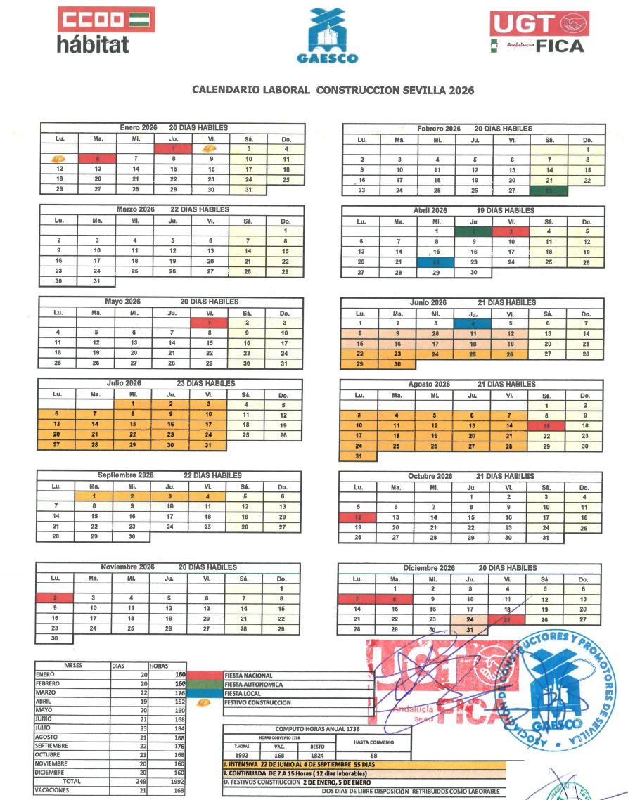 VISTO el Acuerdo de la Comisión Negociadora del Convenio Colectivo del Sector de la Construcción y Obras Públicas de Sevilla (Código 41000915011982), aprobando el calendario laboral para el 2026.