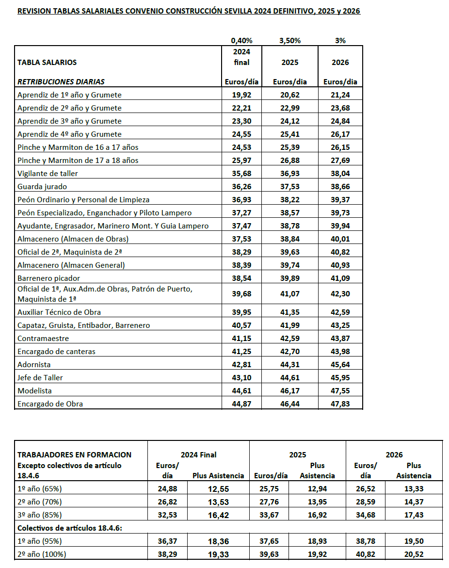 VISTO el Acuerdo de la Comisión Negociadora del Convenio Colectivo de Construcción y Obras Públicas de Sevilla (Código 41000915011982) actualizando tablas salariales para 2025 y 2026.