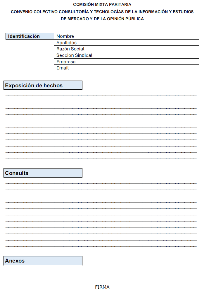 La solicitud de actuación a la Comisión Mixta Paritaria se formalizará por escrito en los términos señalados en el apartado anterior, y en la cual deberá hacerse constar lo siguiente: