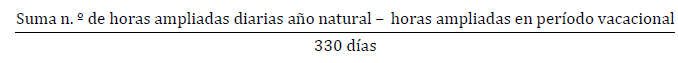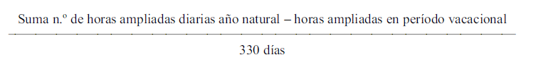 Para determinar la jornada semanal se multiplicará por siete el resultado obtenido de la fórmula anterior. La consolidación se realizará por horas completas, de tal forma que si el resultado fuera inferior a uno no se consolidará y si el resultado fuera igual o superior a uno, se consolidará utilizando la regla del redondeo, al alza o a la baja, para las fracciones de hora.