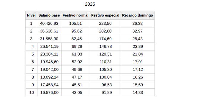 Que en cumplimiento del citado requerimiento, VI. la Comisión Paritaria viene a acordar las siguientes tablas para el 2025: