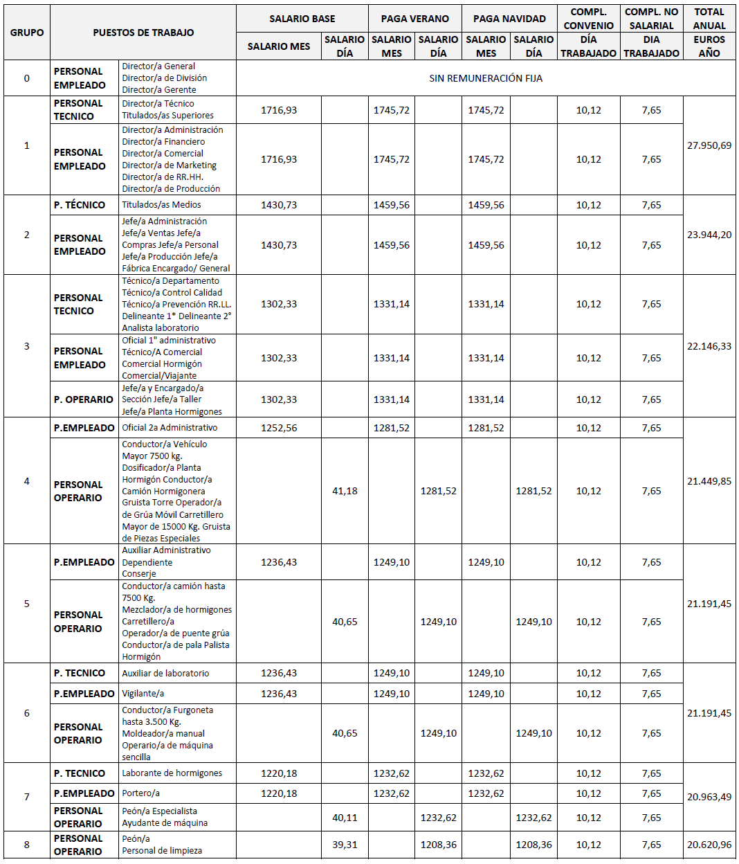 Tabla salarial de 2025. Las cantidades recogidas en dicha tabla de salarios son fruto de la negociación entre las partes firmantes y tienen por objeto dar cumplimiento a los distintos incrementos económicos producidos en años anteriores en el marco del Convenio Colectivo General del Sector de Derivados del Cemento.
