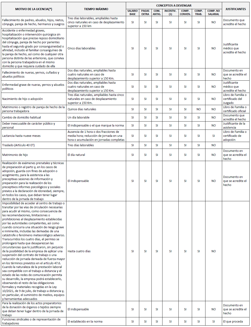 (*) Además, para los supuestos de fallecimiento de familiares hasta 2° grado de consanguinidad o nacimiento de hijos, que requieran desplazamiento al extranjero, así como enfermedad grave por una sola vez al año con los mismos requerimientos, la persona trabajadora tendrá derecho a una licencia retribuida de dos días naturales y no retribuida de otros dos días.