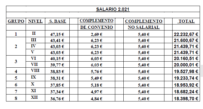 A) Las retribuciones de los trabajadores afectados por este Convenio, para el año 2021, serán las que establecen en la tabla salarial, que como Anexo I se incorpora al mismo, y del que forma parte integrante a todos los efectos, conforme a los niveles o grupos de asimilación establecidos también en dicho anexo.