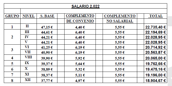 B) Las retribuciones de los trabajadores afectados por este Convenio, para el año 2022, serán las que establecen en la tabla salarial, que como Anexo II se incorpora al mismo, y del que forma parte integrante a todos los efectos, conforme a los niveles o grupos de asimilación establecidos también en dicho anexo.