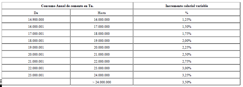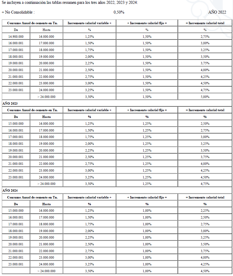1º) Para los ejercicios 2022, se establece un incremento de un fijo de un 1,50%. Asimismo, por circunstancias económicas excepcionales en el año 2022 se acuerda un porcentaje de un 0,5% sobre tablas 2021 no consolidable. A este incremento se le debe añadir un 1,25% resultado de aplicar las tablas de incrementos de consumo de cemento, con lo que da un resultado un incremento del 2,75% sobre las tablas salariales de 2021, a lo que habrá que incluir el 0,5% no consolidable, donde un total de 3,25% sobre la tabla de 2021.