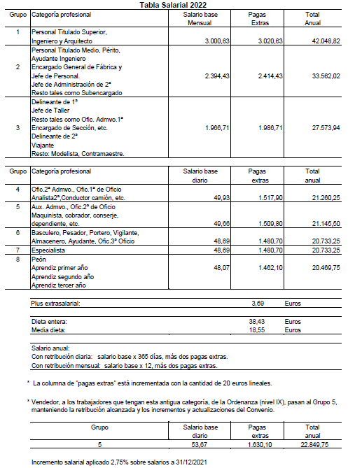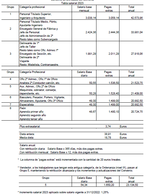Conocido el nivel de consumo de cemento en España en 2022 (14.911.448 toneladas), el incremento salarial variable a aplicar es del +1,25%, que se añadirá al incremento salarial fijo del +1,50%, totalizando un incremento salarial del +2,75% sobre tablas de 2021; unido a ello está el incremento del +0,50% sobre tablas 2021, no consolidable en tablas 2022. Las tablas salariales para cada grupo para los años 2022 y 2023 se detallan en la Tablas Salariales recogidas en el Anexo I de este Convenio.