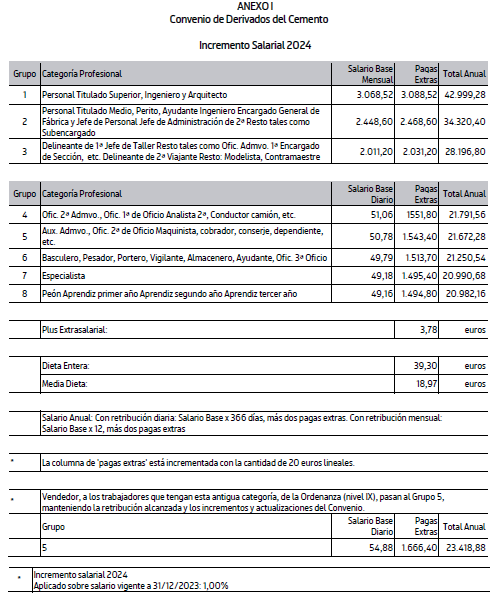 De acuerdo con lo estipulado al efecto en el artículo 12 del Convenio Colectivo de Trabajo para la actividad de Derivados del Cemento de la Comunidad Autónoma de La Rioja para los años 2021-2024, durante el cuarto año de su vigencia, los trabajadores afectados por este Convenio, percibirán por el concepto de salario base desde el 1 de enero al 31 de diciembre de 2024, el que para cada categoría profesional se detalla en las Tablas Salariales incluidas en esta Acta, producto de incrementar los salarios vigentes al 31 de diciembre de 2023, en un 1%.
