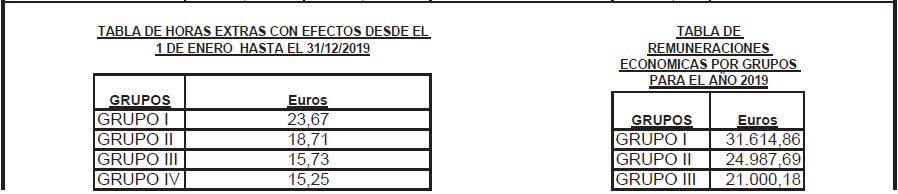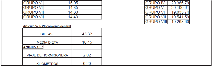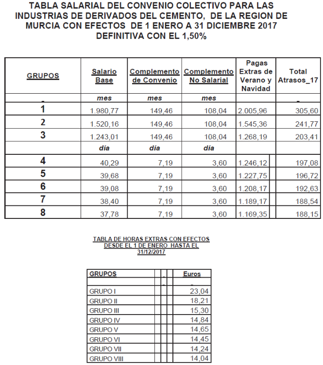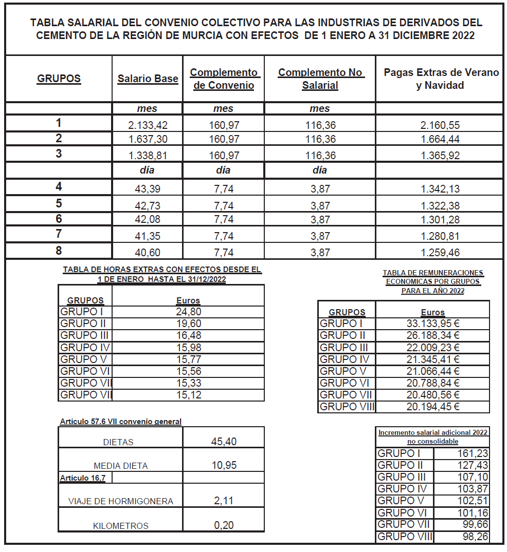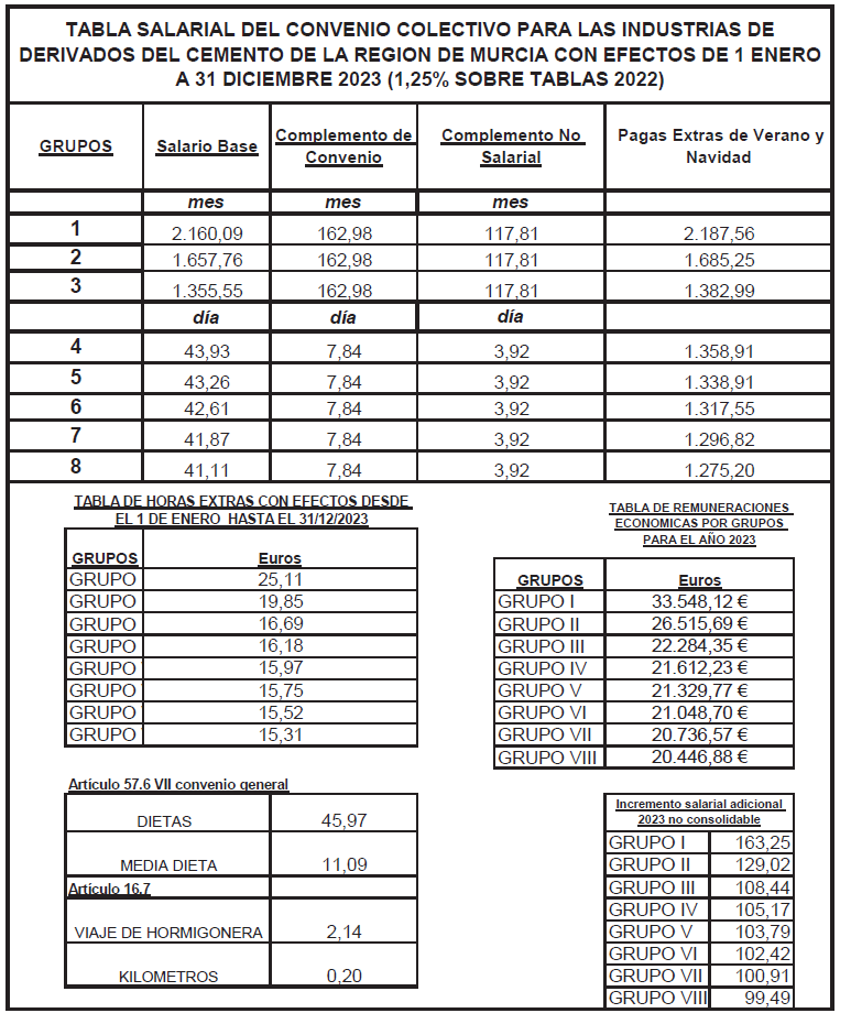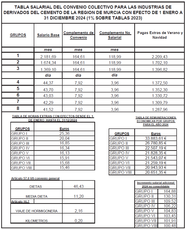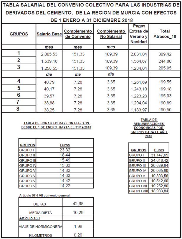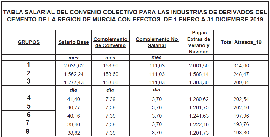 Las partes acuerdan aprobar las tablas salariales correspondientes al año 2019 para las Industrias del Sector de Derivados de Cemento de la Región de Murcia.