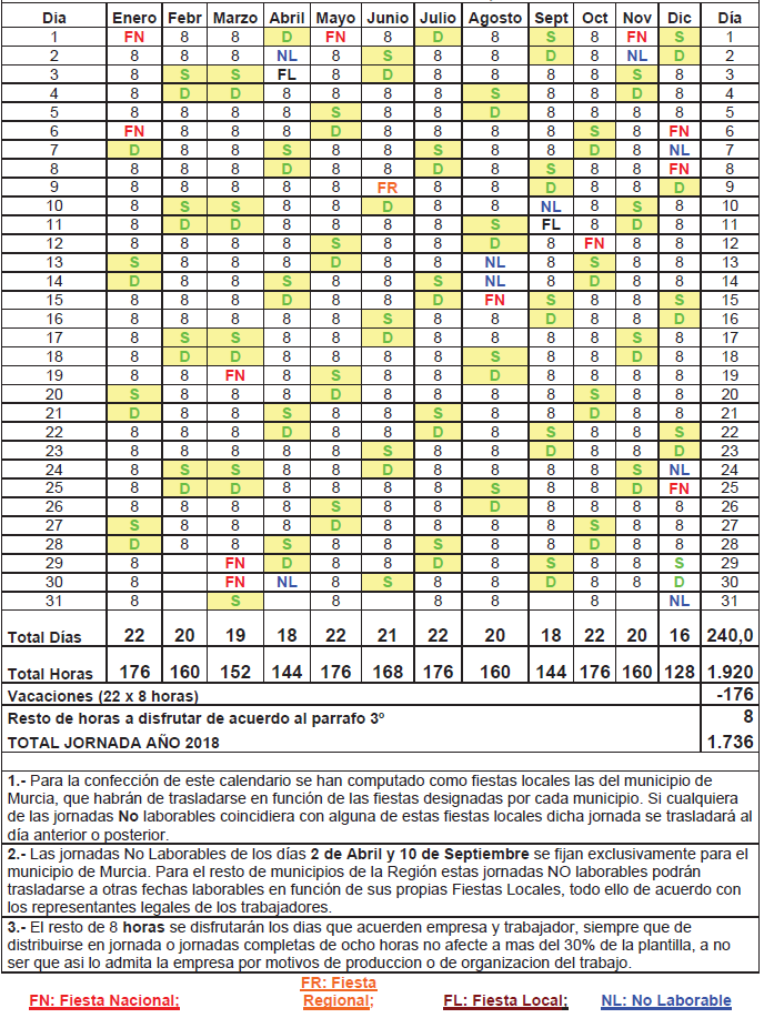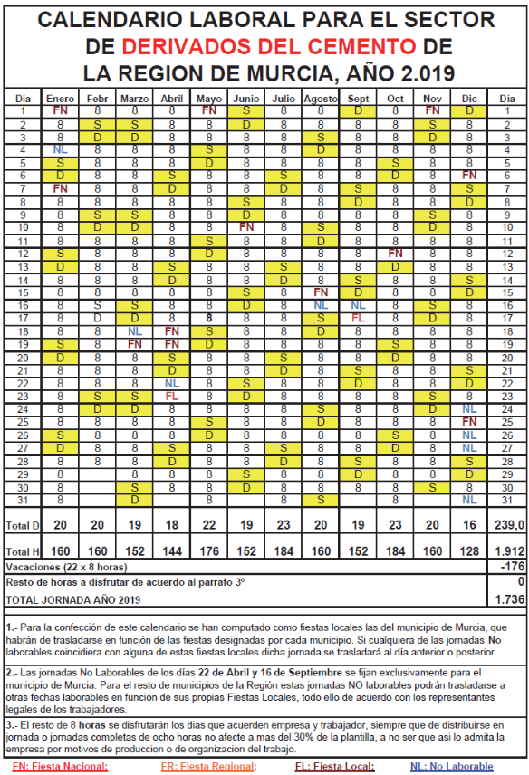 Se hace necesario modificar el calendario laboral, elaborado en base al calendario laboral del Municipio de Murcia, publicado en el BORM del 17 de diciembre de 2019, en cuanto a las jornadas de los días 13 y 14 de abril de 2020, ya que la primera se había fijado como día no laborable por acuerdo de esta comisión paritaria y el día 14 fiesta local, a los efectos de que los trabajadores de la construcción no excedan la jornada anual de 1736 horas que establece el VI Convenio General del sector de la construcción, en especial, aquellos trabajadores que han desarrollado su actividad por estar excepcionados del permiso retribuido de carácter obligatorio, sin perjuicio de que los trabajadores que hubieren disfrutado de dicho permiso, recuperen las horas no trabajadas en virtud de los acuerdos que se alcancen entre las empresas y la representación de los trabajadores.