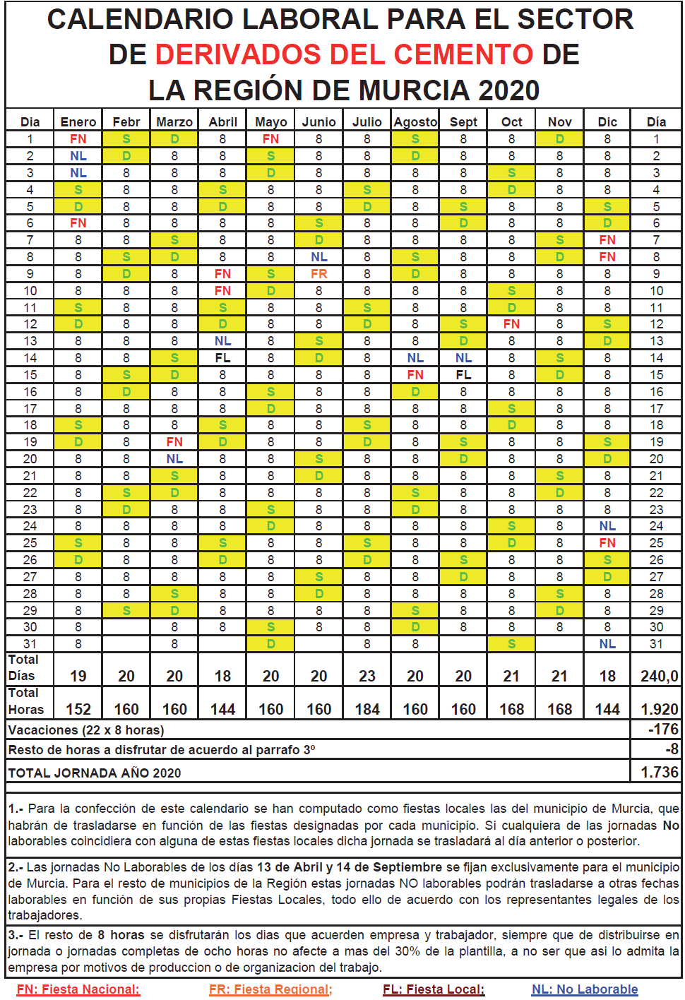 Las partes acuerdan aprobar el calendario laboral del año 2020 para las Industrias del Sector de Derivados de Cemento de la Región de Murcia.