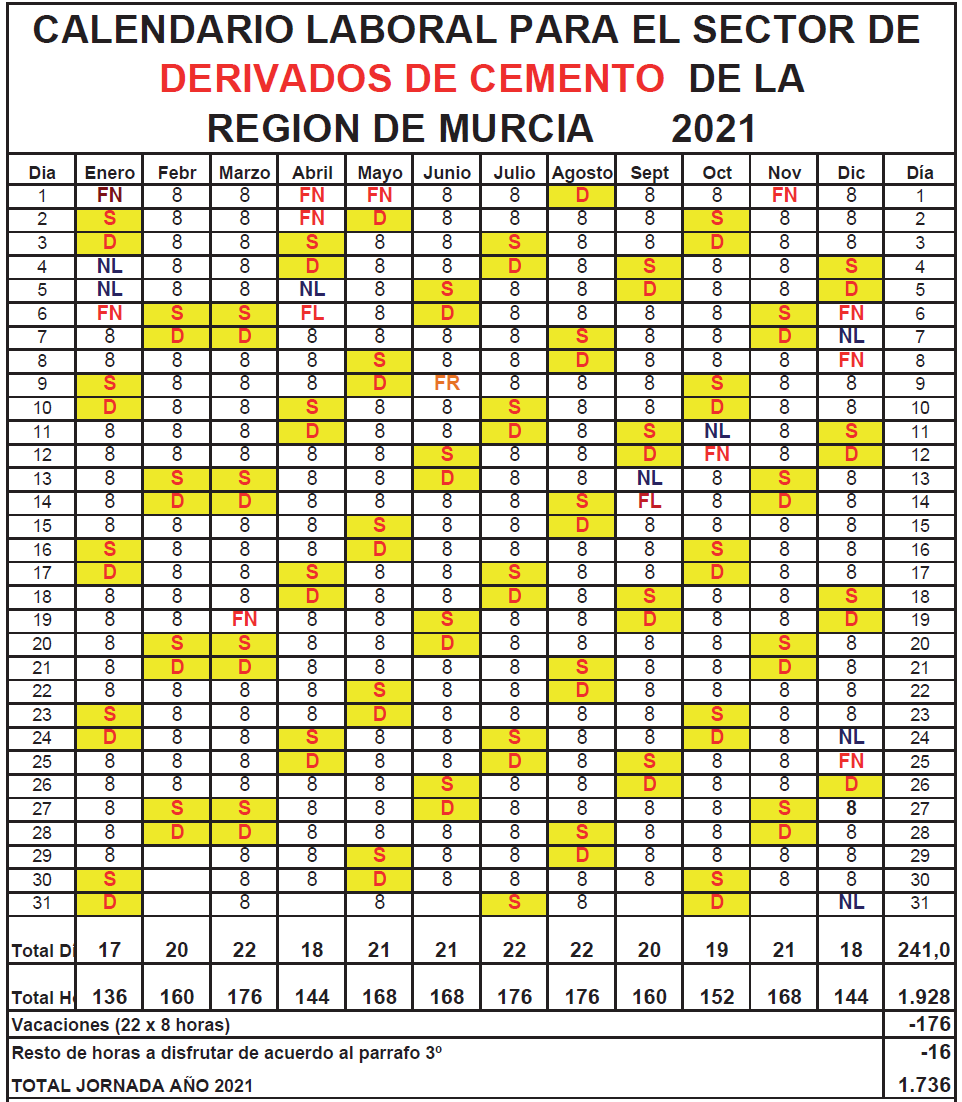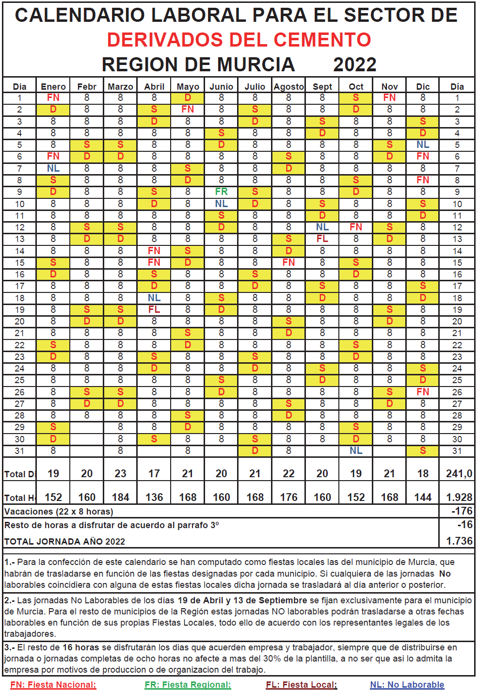 Las partes acuerdan aprobar el calendario laboral del convenio colectivo del Sector Derivados del Cemento de la Región de Murcia, para el año 2022.