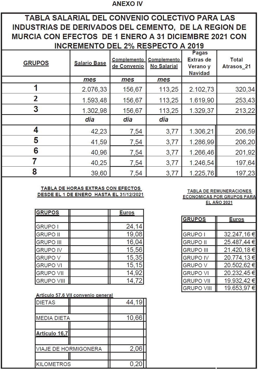 Las partes acuerdan aprobar las tablas salariales correspondientes al año 2021 para las Industrias del Sector de Derivados de Cemento de la Región de Murcia.
