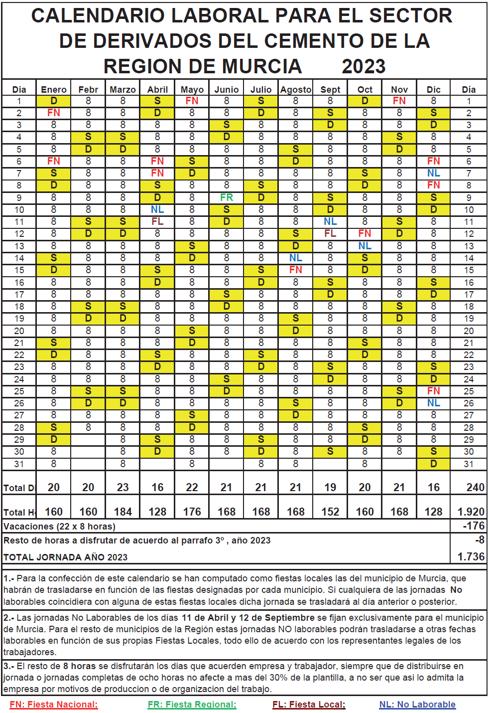 Las partes acuerdan aprobar el calendario laboral del convenio colectivo del Sector de derivados del cemento de la Región de Murcia, para el año 2023.