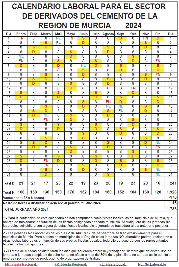 Las partes acuerdan aprobar el calendario laboral del convenio colectivo del Sector de Derivados de Cemento de la Región de Murcia, para el año 2024.