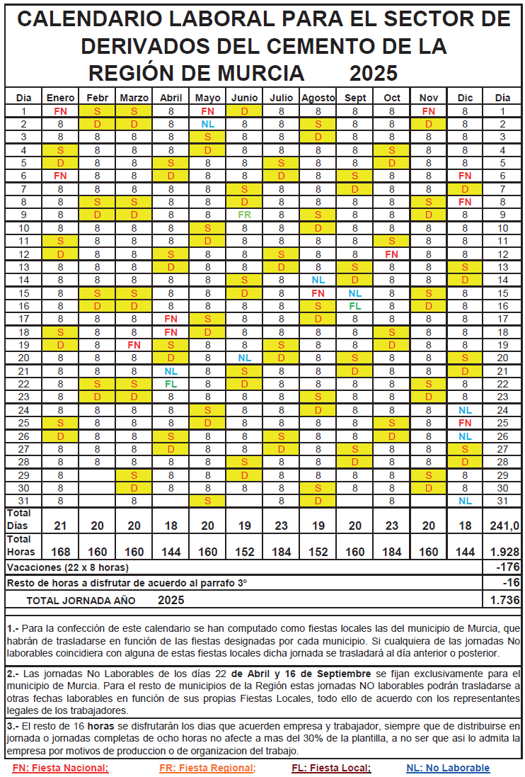 Las partes acuerdan aprobar el calendario laboral del Convenio Colectivo del Sector de los Derivados del Cemento de la Región de Murcia, para el año 2025.