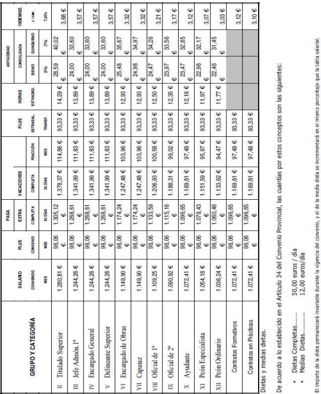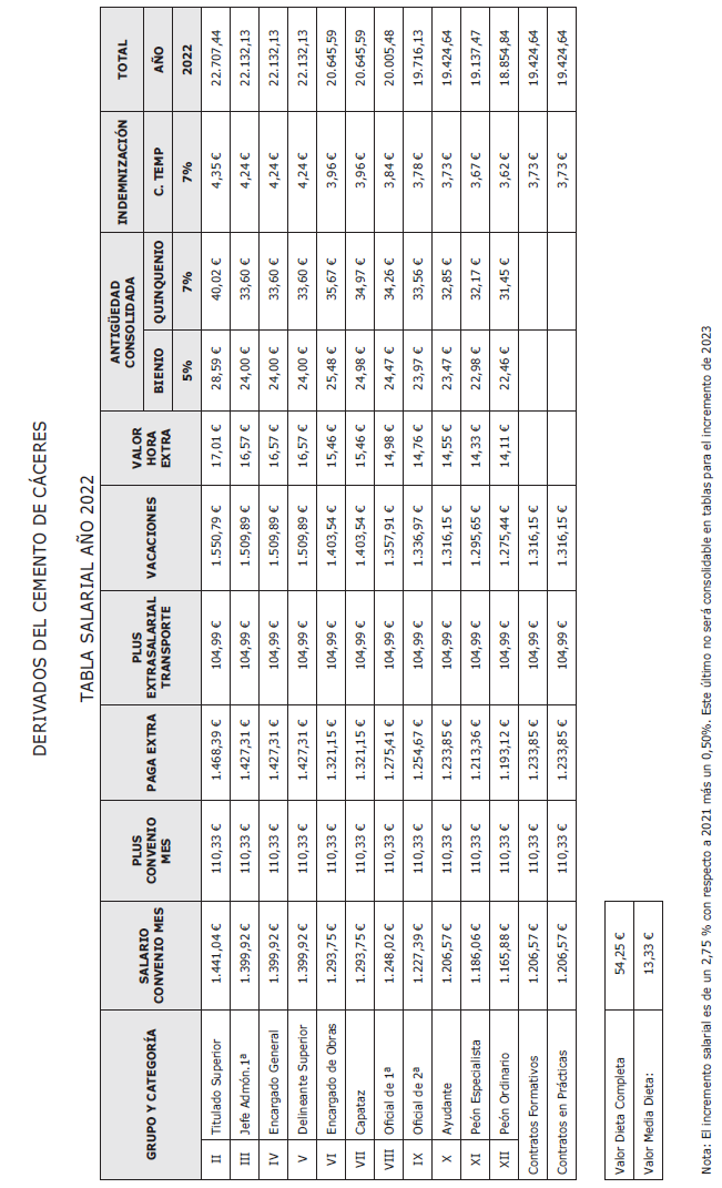 Segundo. Se acuerda por los miembros de la misma la firma de la tabla salarial 2022, que representa un incremento salarial del 2,75 % respecto a las tablas salariales provinciales del año 2021 más un 0,50%, cantidad esta última que no será consolidable en tablas para 2023, conforme a lo pactado por la Comisión Negociadora del VII Convenio General del Sector de Derivados del Cemento publicada en el BOE de 14 de julio de 2023.