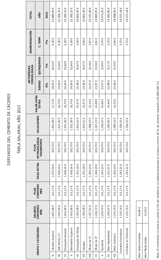 RESOLUCIÓN de 19 de diciembre de 2023, de la Dirección General de Trabajo, por la que se ordena la inscripción en el Registro de Convenios y Acuerdos Colectivos de Trabajo de la Comunidad Autónoma de Extremadura y se dispone la publicación del Acta, de fecha 30 de noviembre de 2023, suscrita por la Comisión Negociadora del Convenio Colectivo de derivados del cemento para la provincia de Cáceres 2013-2016, en la que se acordó el establecimiento de las tablas salariales de la anualidad 2023 en el ámbito de aplicación del citado convenio.