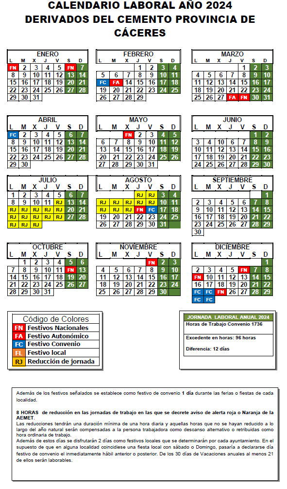 1. Se establecen como días festivos de convenio para el sector de derivados del cemento de la provincia de Cáceres durante el año 2024 los siguientes: