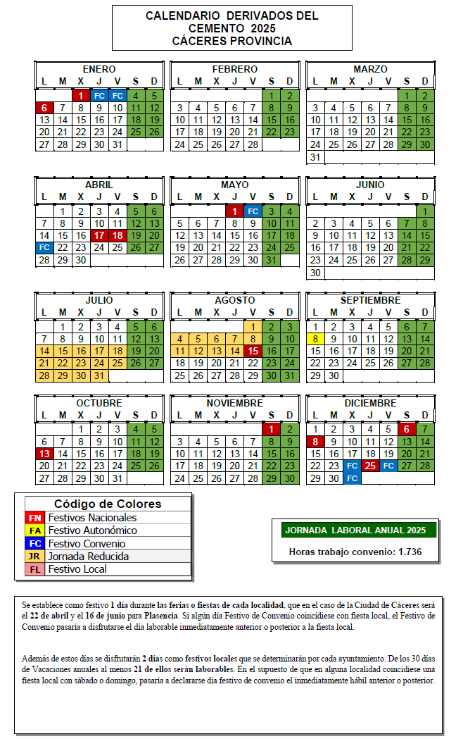 1. Se establecen como días festivos de convenio para el sector de derivados del cemento de la provincia de Cáceres durante el año 2025 los siguientes: