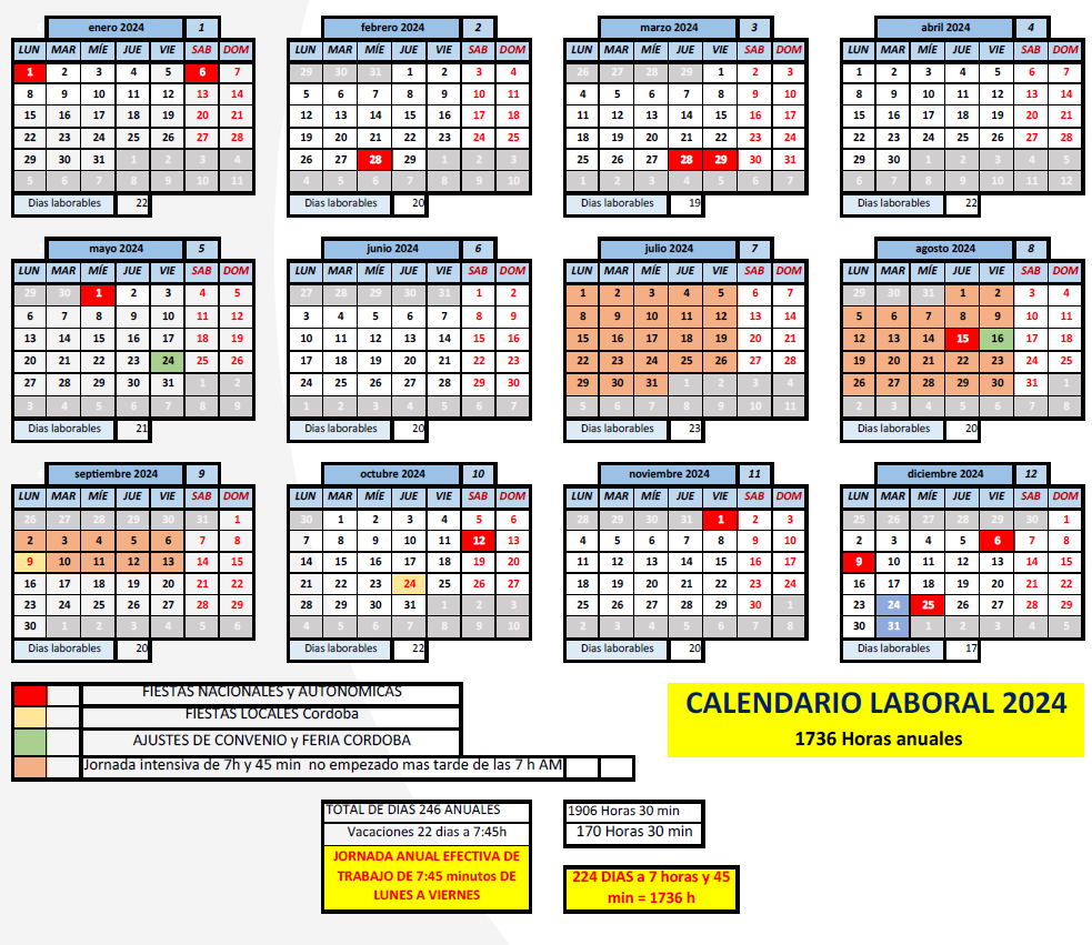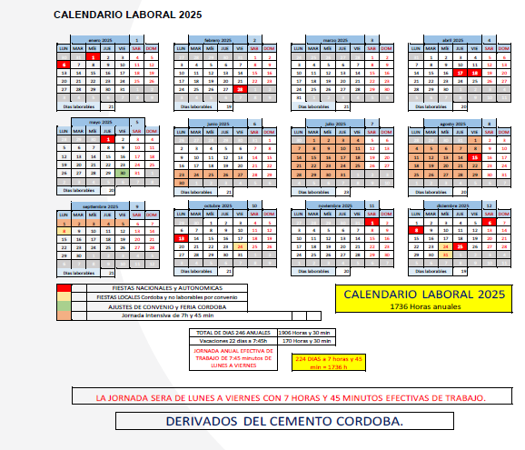 2º. El cuadro calendario que figura como anexo, se ha elaborado teniendo en cuenta las fiestas locales de Córdoba capital, así como su feria de Mayo, las empresas y los representantes legales de los trabajadores deberán adaptar el presente calendario a las fiestas y ferias de cada localidad. Asimismo, de mutuo acuerdo, empresa y representantes de los trabajadores y trabajadoras podrán elaborar su propio calendario, siempre que lo hagan antes del 31 de enero de cada año, y respetando en cualquier caso el periodo de jornada continuada que se refleje en el calendario provincial del sector vigente en cada momento.