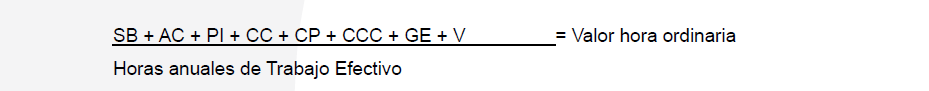 A los efectos de lo dispuesto en el capítulo VII, artículo 35.4 del presente Convenio, la fórmula para determinar el valor hora con el fin de abonar posibles excesos en supuestos de distribución irregular de la jornada será la siguiente:.