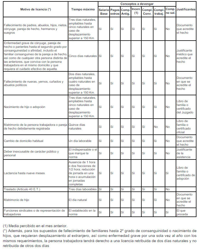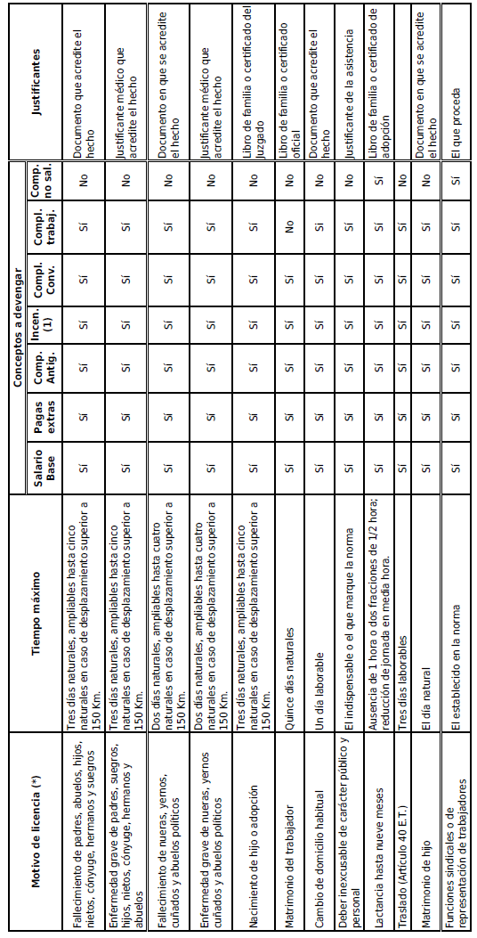 Reproducimos como Anexo III «Cuadro de permisos y licencias» en los que el trabajador, previo aviso y justificación, podrá ausentarse del trabajo, por el tiempo y en las condiciones establecidas en el mismo.