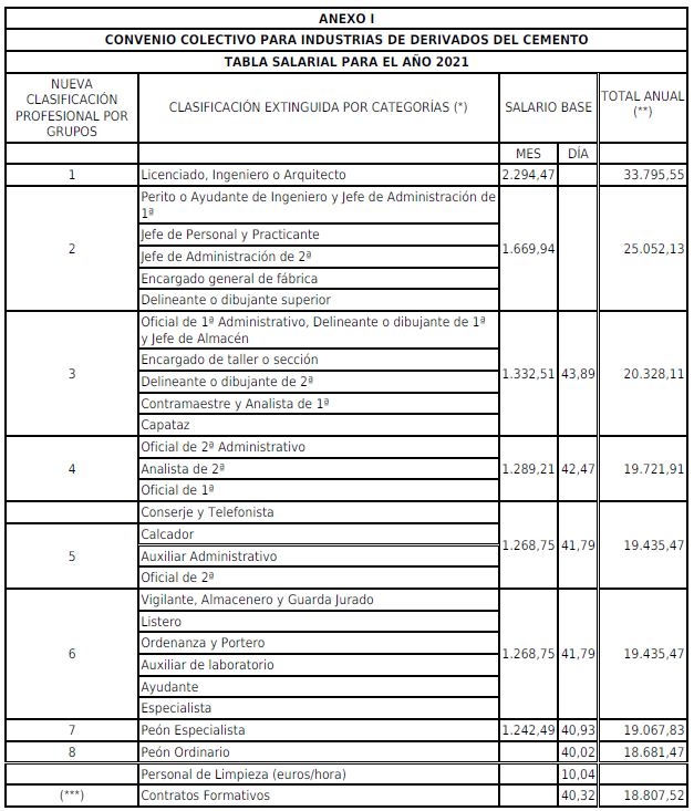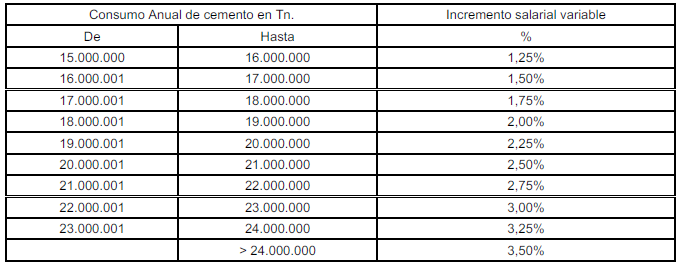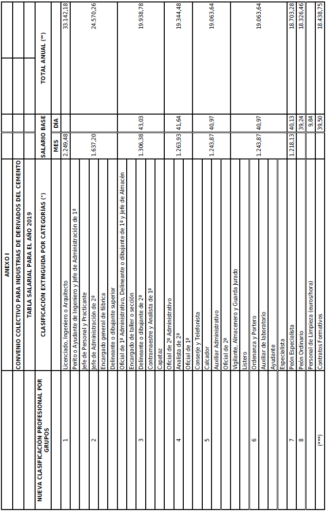 SEGUNDO.- Las tablas salariales para el año 2019, que se adjuntan como Anexo I al presente texto, son el resultado de incrementar el 1,50 % sobre las tablas de 2018, según la Disposición Final Primera del VII Convenio General de Derivados del Cemento, una vez conocido el incremento del consumo de cemento correspondiente al año 2019, en aplicación al acuerdo alcanzado publicado en el BOE de fecha 12-agosto-2020.