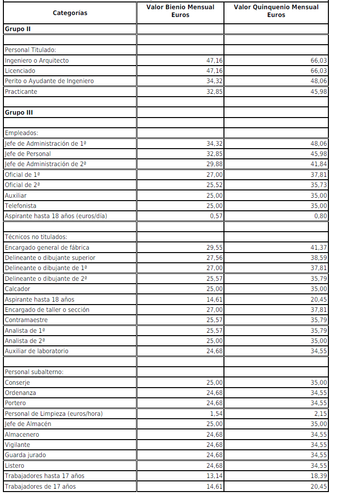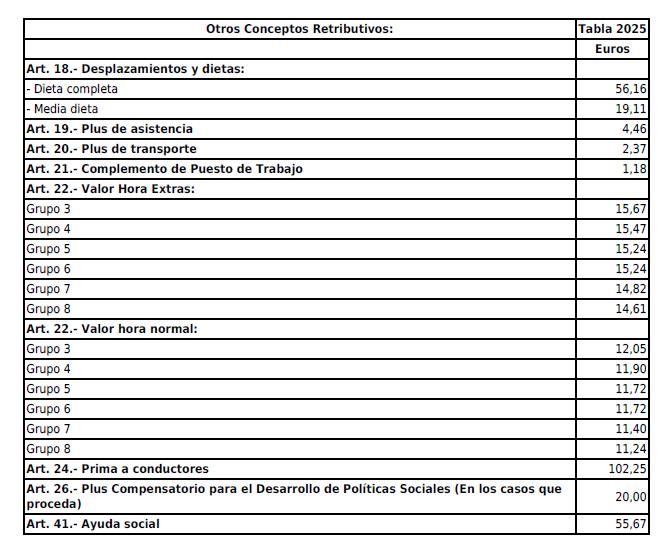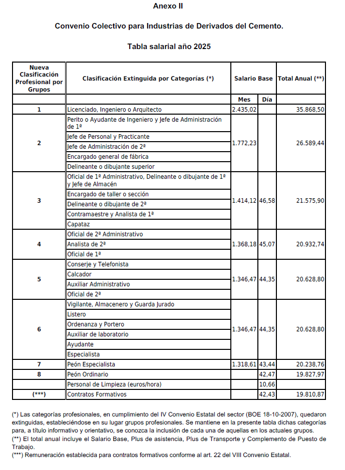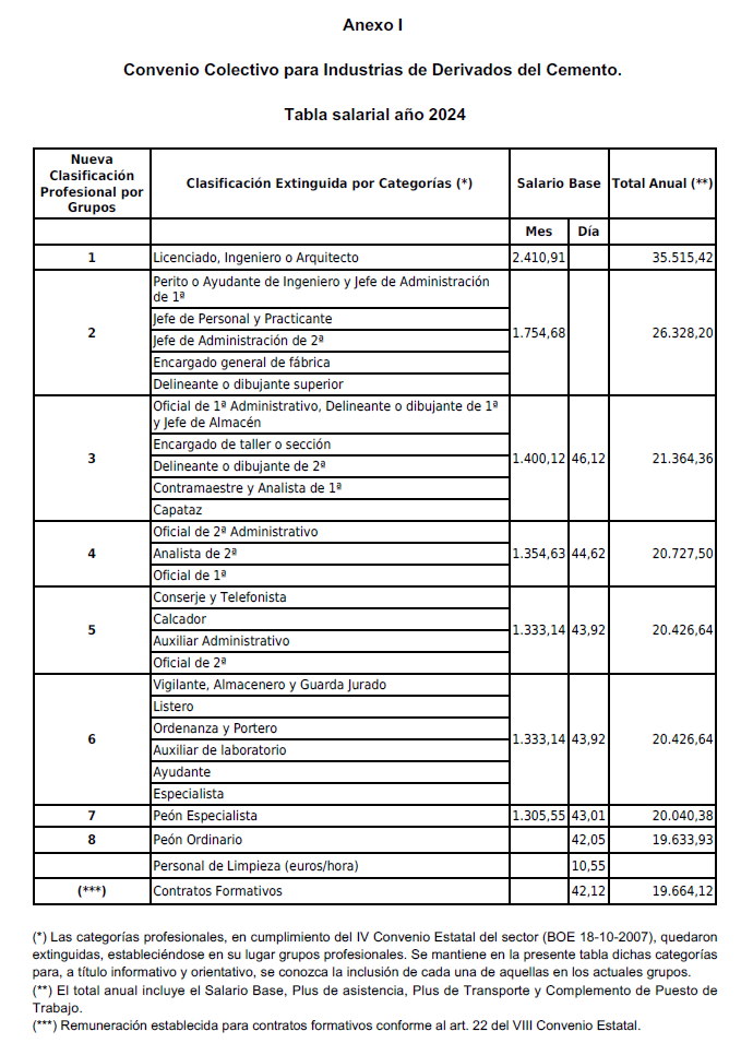 En cumplimiento de la Disposición final primera del VIII Convenio General de Derivados del Cemento publicado en BOE de fecha 14/7/2023, se procede a la elaboración de las tablas de salarios correspondientes a los años 2024 y 2025 que establece un incremento salarial fijo del 1% para el año 2024 y un 1% para el año 2025. (Se adjuntan como parte integrante de este acta como Anexos).