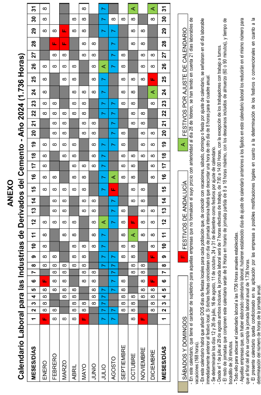 Vista el Acta de fecha 01 de febrero de 2024, recibida en el registro de Convenios colectivos, acuerdos colectivos de trabajo y planes de igualdad de esta Delegación Territorial el mismo día 01/02/2024, por la que se aprueba el Calendario Laboral para las Industrias de Derivados del Cemento – año 2024, y de conformidad con lo establecido en el artículo 90 apartados 2 y 3 del Real Decreto Legislativo 2/2015, de 23 de octubre, por el que se aprueba el Texto Refundido de la Ley del Estatuto de los Trabajadores, Real Decreto 713/2010, de 28 de mayo, sobre registro y depósito de convenios colectivos, acuerdos colectivos de trabajo y planes de igualdad; sobre la base de las competencias atribuidas a esta Delegación Territorial por el Real Decreto 4043/82, de 29 de diciembre, sobre Traspaso de Funciones y Servicios de la Administración del Estado a la Junta de Andalucía en materia de Trabajo, Decreto del Presidente 10/2022, de 25 de julio, sobre reestructuración de Consejerías (BOJA extraordinario núm. 25, de 26 de julio), modificado por Decreto del Presidente 13/2022, de 8 de agosto (BOJA extraordinario número 27, de 08 de agosto), en relación con el Decreto 155/2022, de 9 de agosto, por el que se regula la estructura orgánica de la Consejería de Empleo, Empresa y Trabajo Autónomo (BOJA extraordinario número 28, de 11 de agosto), y Decreto 300/2022, de 30 de agosto, por el que se modifica el Decreto 226/2020, de 29 de diciembre, por el que se regula la organización territorial provincial de la Administración de la Junta de Andalucía (BOJA extraordinario número 29, de 30 de agosto), esta Delegación Territorial, acuerda: