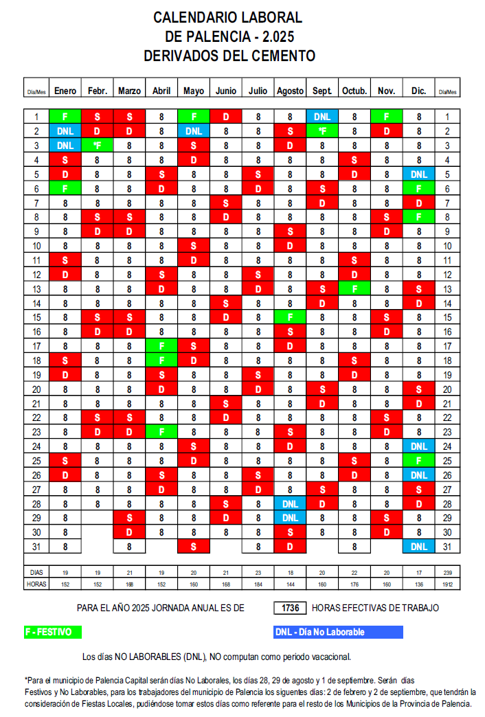 PRIMERO: Calendario Laboral 2025.- Se acuerda una jornada anual del Sector de 1.736 horas y como Días No Laborables (D.N.L.) los que siguen: 2 y 3 de enero, 2 de mayo, 28, 29 de agosto, 1 de septiembre y 5, 24, 26 y 31 de diciembre.