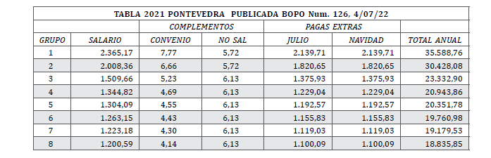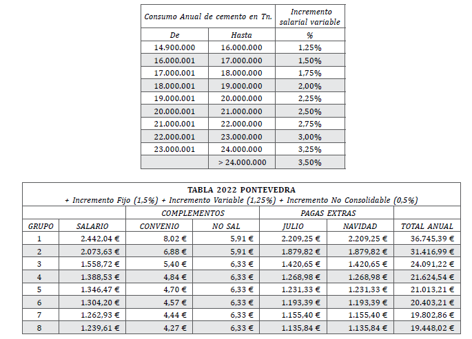 El 06 de febrero de 2022, ambas partes acuerdan suscribir el acuerdo salarial del año 2021, basándose en las siguientes circunstancias: en primer lugar la patronal desea dejar patente el reconocimiento a los personas trabajadoras del sector en circunstancias tan excepcionales como las vividas durante la pandemia en 2020, acordándose un abono de un emolumento extraordinario del 0,5%; a ello es preciso añadir el incremento salarial debido al aumento de consumo de cemento de 2021, que se estima está en la horquilla de +1,5%, según la tabla de la Disposición final primera del VII Convenio General del Sector de Derivados del Cemento, prorrogándose durante 2021 todos los términos del VII Convenio. De esta forma, el incremento salarial acordado para 2021 es de +2% sobre las tablas de 2019 (y de 2020), con efectos desde el día de la firma, con independencia de su fecha de publicación en el BOP y todo ello con carácter retroactivo desde 1 de enero de 2021, siendo pagaderos los atrasos al mes de su publicación en el BOP: