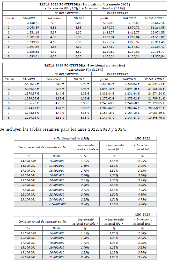 Según lo establecido en la Disposición Final Primera del Convenio Provincial de Pontevedra, se establece un Incremento Provisional del 1% para el año 2024, pendiente de revisión a final de año, una vez conocido el consumo anual de cemento de España según la tabla adscrita en la misma Disposición Adicional Primera.