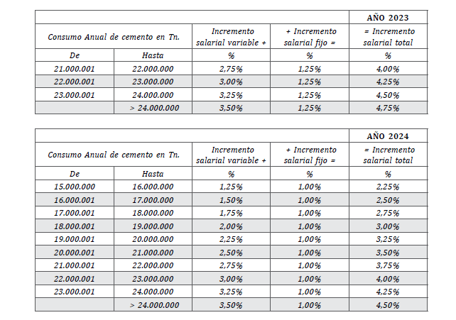 A los incrementos fijos anteriores se añadirá un variable según el consumo anual de cemento de España según la siguiente tabla: