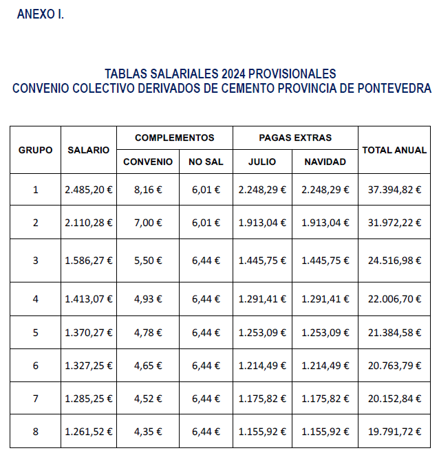 ACORDO SOBRE AS TÁBOAS SALARIAIS E O CALENDARIO LABORAL DO ANO 2024, PARA O PERSOAL DAS EMPRESAS DO SECTOR DE DERIVADOS DO CEMENTO.