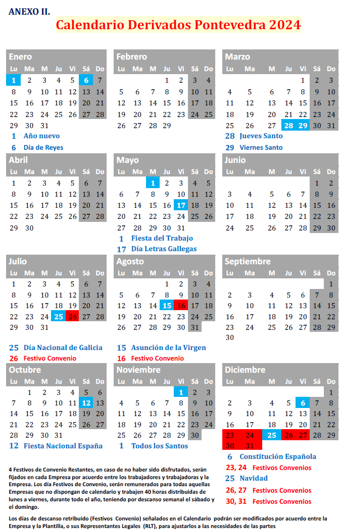 Según el artículo 35.- «Jornada» del actual Convenio, en su apartado a) que fija una jornada anual de 1736 horas y el apartado f), que habla de pactar un calendario laboral orientativo en el Convenio Provincial, junto las Competencias atribuidas a esta Comisión Paritaria en su artículo 16.e); es preciso fijar en el calendario laboral para el año 2024 un total de 12 días festivos de convenio, de los cuales 8 se fijan por esta comisión, y los 4 restantes, en caso de no tenerse disfrutado, serán fijados en cada Empresa por acuerdo entre los trabajadores/as y la Empresa.